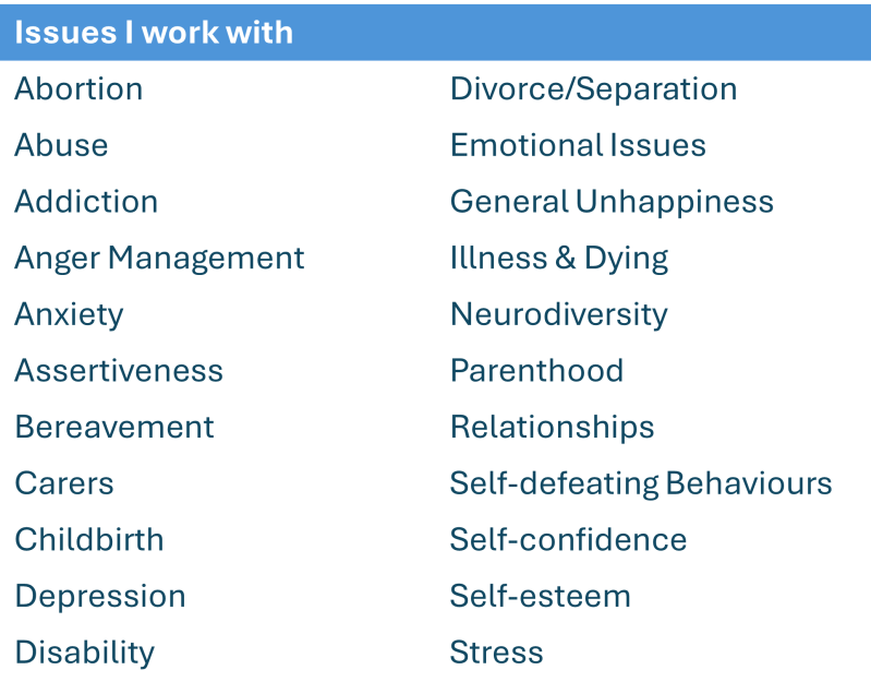 Sessions last 50 minutes, during which you can freely discuss your thoughts, emotions, and goals in a confidential and supportive environment. I work face-to-face, online and by telephone. In some circumstances I can offer home visits.